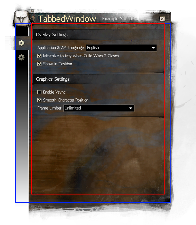 exampleWindow.Tabs.Add(new Tab(Content.GetTexture("155052"), () => new OverlaySettingsView(), "Settings"));